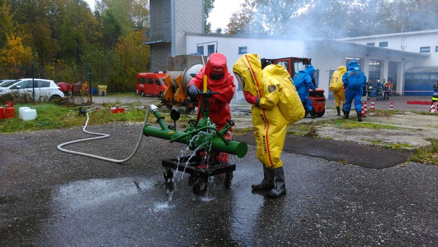 Danach wurden verschiedende Einsatzlagen wie ein Unfall in einem Labor, ein Unfall beim Transport in einen LKW, ein Unfall mit einem Gabelstapler und eine Leckage an einer Leitung mit Gefahrstoff angenommen. Die Feuerwehr Reichertshofen ergänzte diese Übungen durch den Dekon-P Anhänger um die Einsatzkräfte und auch die verletzten geretteten Personen zu dekontaminieren.