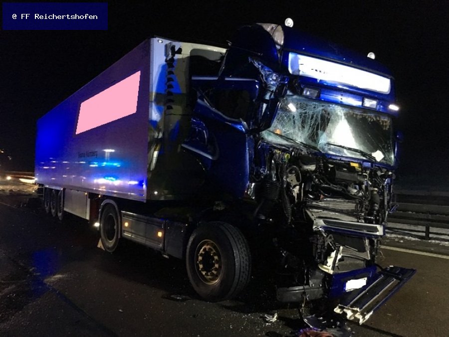 Vor Ort stellte sich heraus, dass zwei LKW´s aufeinander gefahren waren. Beim auffahrenden LKW musste der Fahrer aus der Kabine mit hydraulischem Rettungsgerät befreit werden.