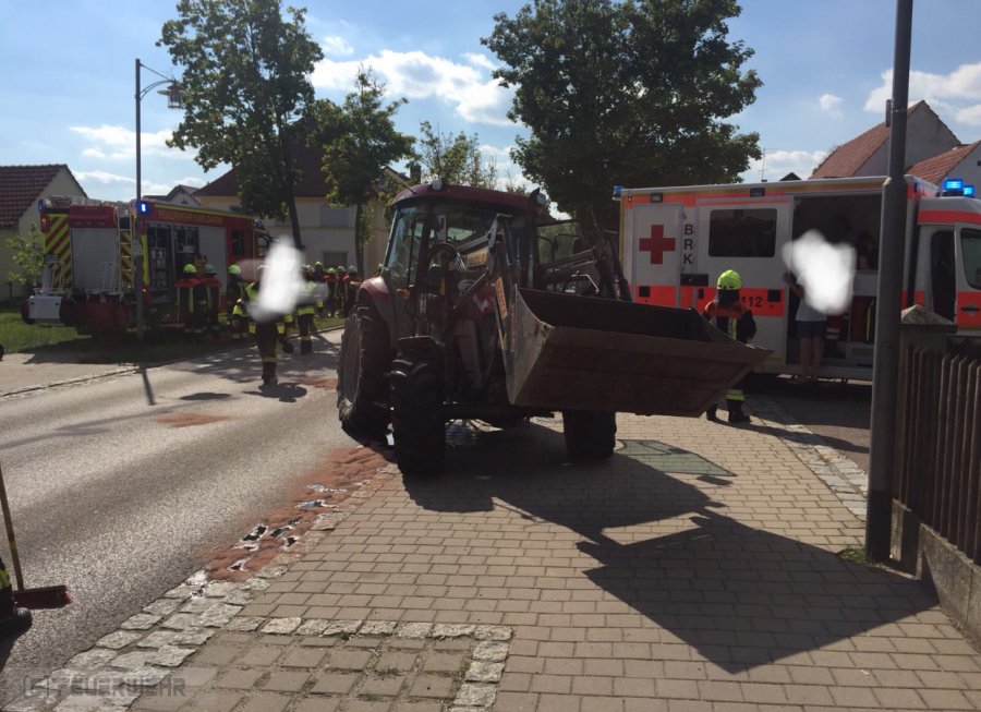 Unterstützung der Feuerwehr Karlskron bei einem Verkehrsunfall mit eingeklemmter Person in Karlskron. Entgegen der Einsatzmeldung wurde bei dem Zusammenstoss eines Traktors mit einem PKW niemand eingeklemmt. Die verletzten Personen wurden vom BRK Rettungsdienst versorgt. Auslaufende Betriebsstoffe wurde aufgenommen und eine Verkehrsregelung erstellt.
