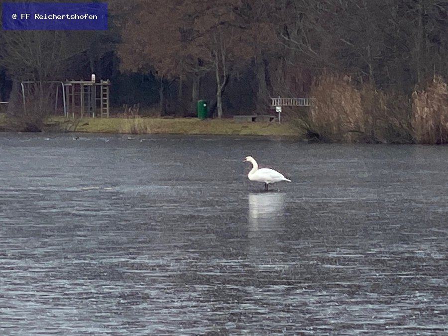 Gleich mehrere Anrufe beim 1. und 2. Kommandanten gingen ein, in denen gemeldet wurde dass ein Schwan am Heideweiher eingefroren sei. Der Bauhof Reichertshofen ist ebenso verständigt und auf dem Weg dorthin.
