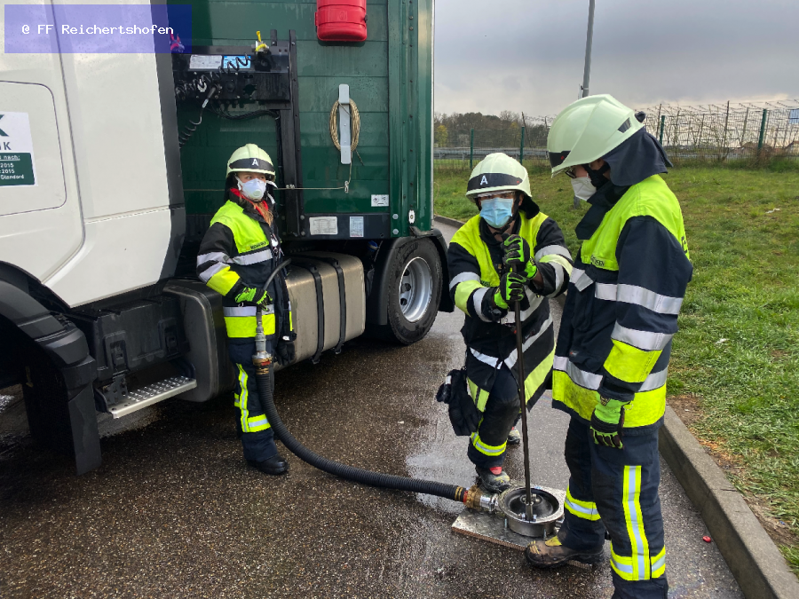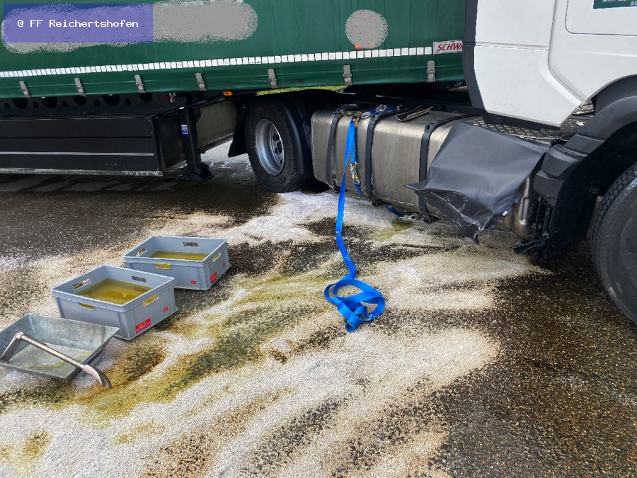 Von der Feuerwehr Winden am Aign nachgefordert, wurden wir zu einem größeren Austritt von Diesel aus einem LKW. Dieser hatte bereits auf der Autobahn einen Schaden an seinem Fahrzeugtank, fuhr jedoch weiter bis zur Ausfahrt und dort in die Tankstelle auf den Parkplatz. Die Dieselspur zog sich also über mehrere Kilometer.