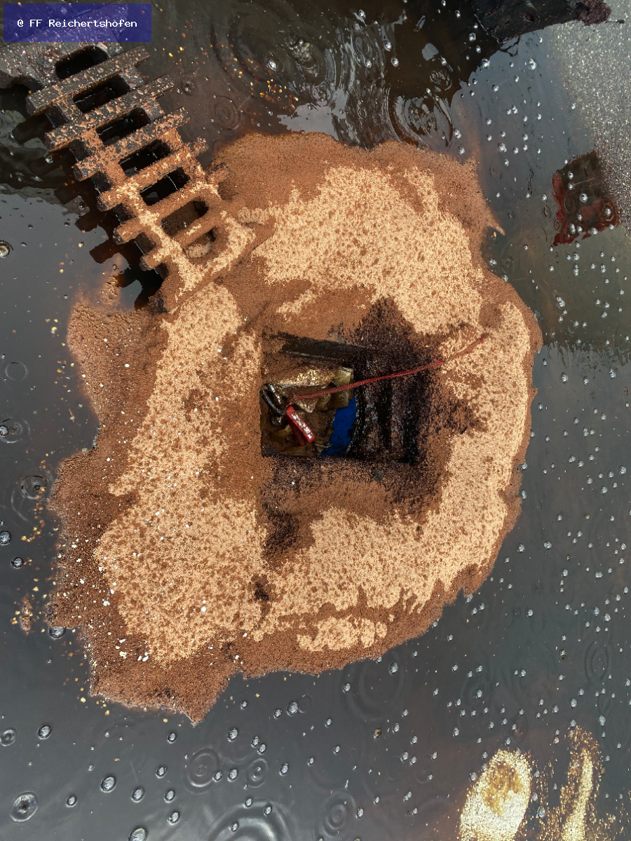 Bei unserer Ankunft war die Feuerwehr Winden bereits mit dem Abdichten des Leck geschlagenen Tanks fertig, so dass nicht mehr viel weiteres Diesel austrat. Bedingt durch den anhaltenden Regen wurde der Diesel aber weit verteilt und drohte in mehrere Gullys zu laufen.