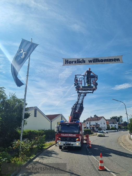 Wir haben mit der Drehleiter das Banner "Herzilich Willkommen" aufgehängt.