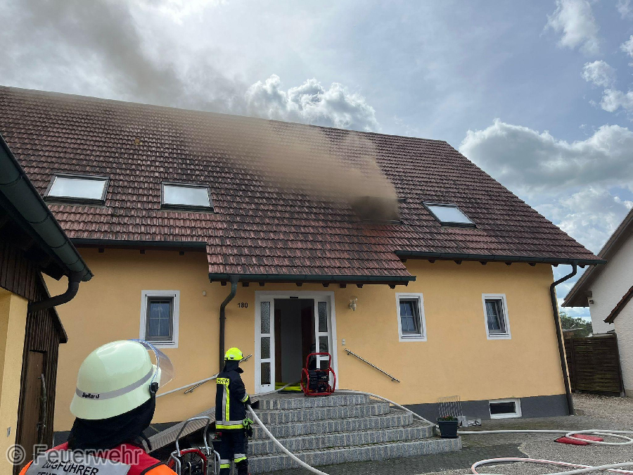 Wir wurden zu einem Dachstuhlbrand alarmiert, alle Personen hatten bereits das Dopplehaus verlassen.