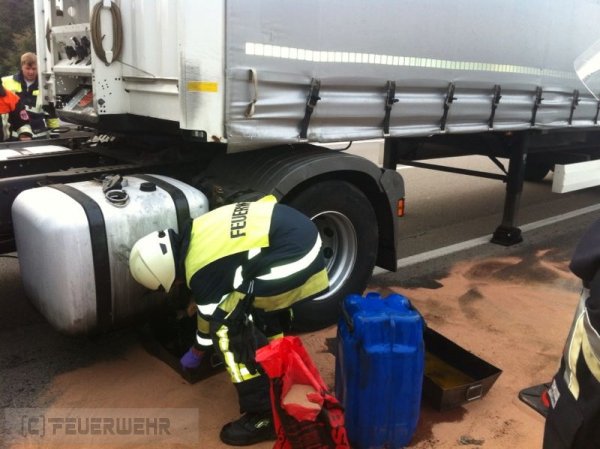 Bei einem Verkehrsunfall mit vier beteiligten Fahrzeugen (2 PKW und 2 LKW) wurde bei einem LKW der Kraftstofftank aufgerissen, wodurch einige Liter Diesel ausliefen. Der ca. 400 Liter umfassende Inhalt des Tankes wurde umgepumpt und das ausgelaufene Diesel mittels Ölbinder gebunden. Ein nahegelegener Entwässerungsschacht wurde abgedichtet um ein weiteres Einfließen des Kraftstoffes zu verhindern. Da bereits eine unbekannte Menge an Diesel in die Entwässerung eingeflossen war, wurde am nahegelegenen Auffangbecken der Autobahnentwässerung eine Ölsperre eingebracht.