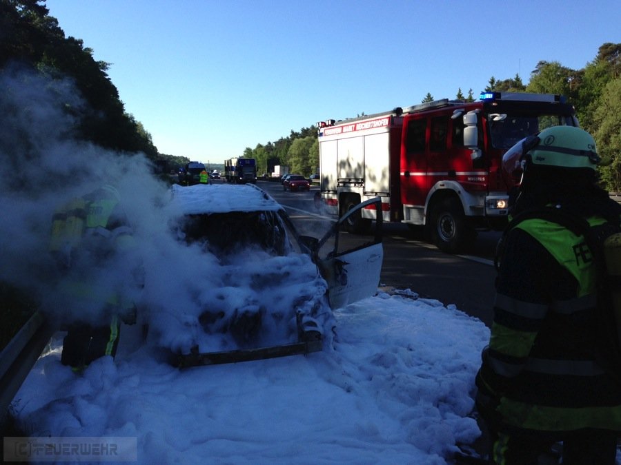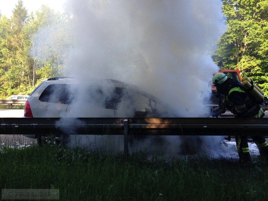 Der PKW fing aus ungeklärter Ursache im voderen Teil Feuer und wurde gelöscht. Eine Verkehrsabsicherung wurde erstellt.