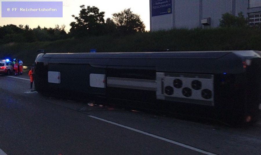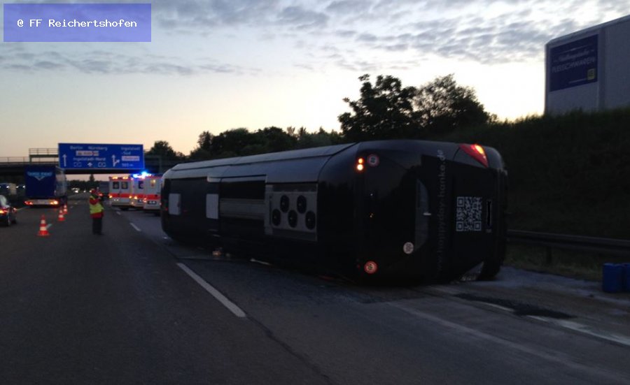 Wir wurden gemeinsm mit den Feuerwehren Manching und der Berufsfeuerwehr Ingolstadt alarmiert. Auf der A9, Fahrtrichtung Nürnberg, kurz vor der Ausfahrt Ingolstadt Süd kippte ein Reisebus um. Dabei wurden vier Personen der ca. 20 Insassen verletzt.