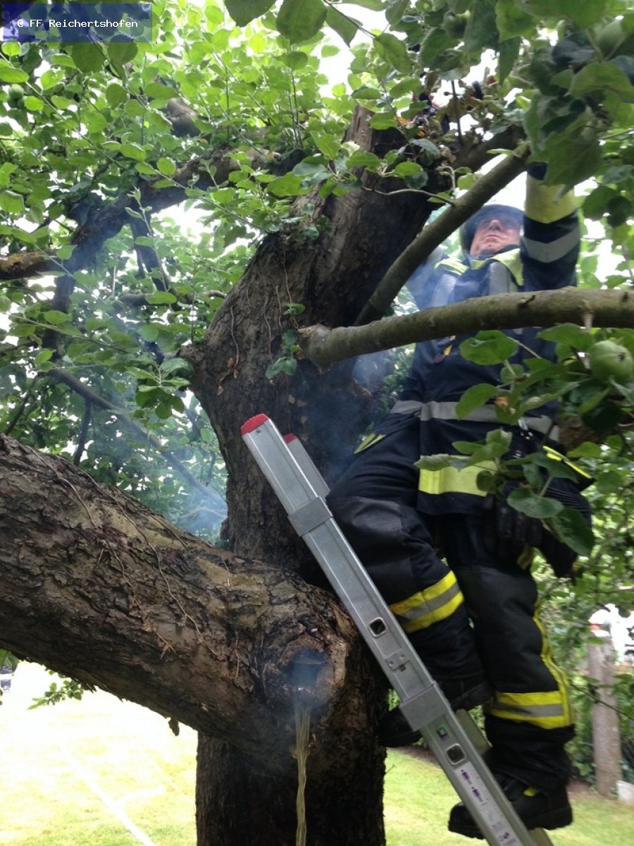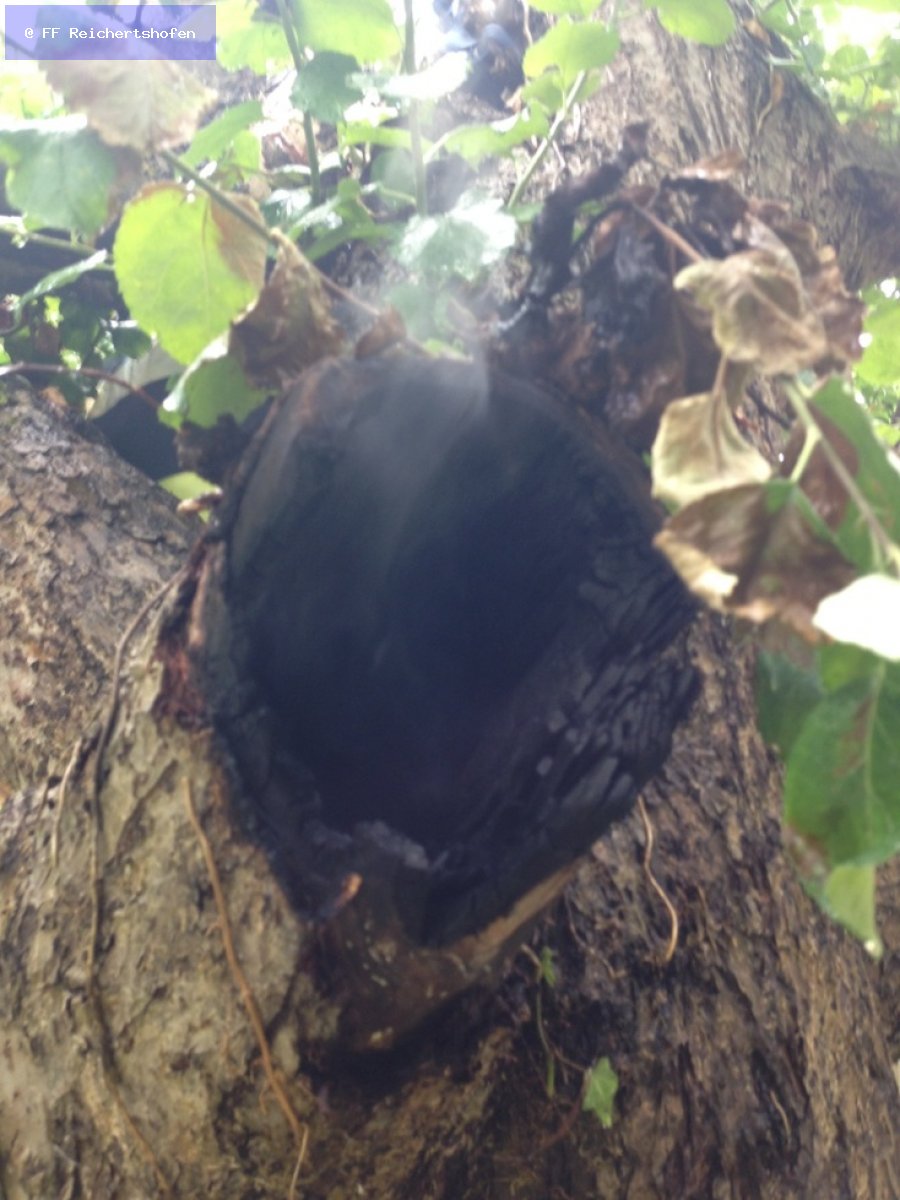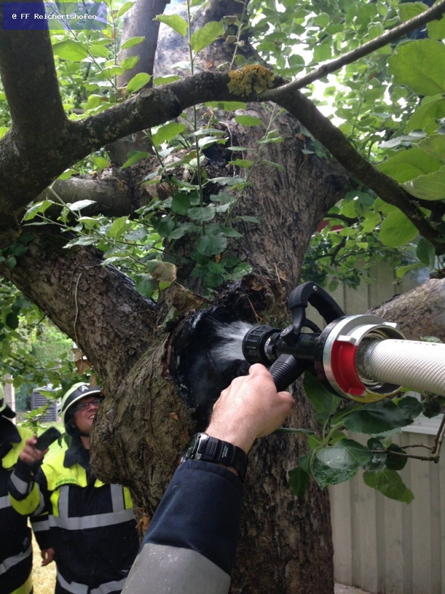 Zu einem ungewöhnlichen Brand wurde die Feuerwehr Reichertshofen in die Münchener Straße gerufen. Dort brannte ein Apfelbaum. Dieser brannte aber nicht an den derzeit sehr trocknen Blättern, sondern im Inneren des Stammes. Aus allen "Astlöchern" oder abgesägten Stumpfen rauchte der Baum bzw. brannte es heraus.