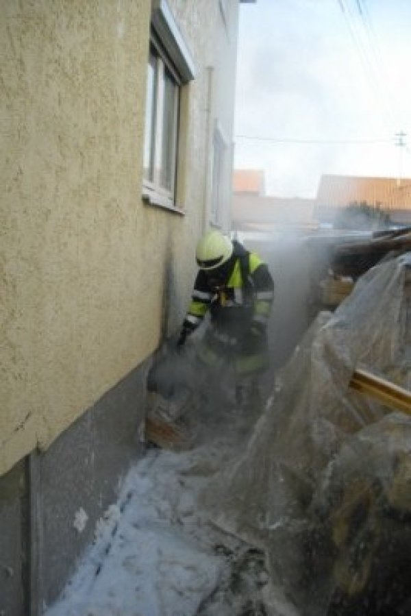 Beim Eintreffen der Feuerwehr befand sich die gefährdete Person bereits außerhalb des Gebäudes. Dichter Rauch drang aus dem Keller und dem Erdgeschoss. Nach ersten Erkundungen standen im Kellerraum ca. 25qm Brennholz im Vollbrand. Diese wurden durch die Vornahme eines C-Rohres sowie eines Hochdrucklöschers abgelöscht. Weiter wurde ein Hochdrucklüfter in Stellung gebracht. Das Brandgut wurde Stückweise nach draußen gebracht und der Kellerraum freigeräumt.