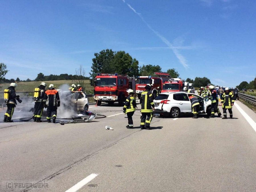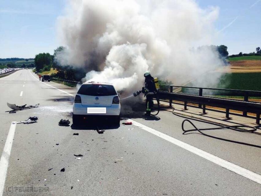 Durch einen Verkehrsunfall mit zwei beteiligten Fahrzeugen, geriet heute Mittag auf der BAB 9, Fahrtrichtung München, ein PKW in Brand. Bis zum Eintreffen des Rettungsdienstes wurden die leichtverletzten Personen medizinisch erstversorgt. Parallel wurde der PKW-Brand abgelöscht.