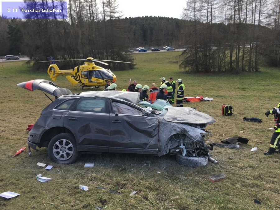 Wir wurden gemeinsam mit den Feuerwehren aus Wolnzach, Langenbruck, Pörnbach und Rohrbach zu einem Verkehrsunfall alarmiert. Da die Meldung lautete: Verkehrsunfall, mehrere Personen eingeklemmt, PKW brennt, waren soviele Kräft notwendig!