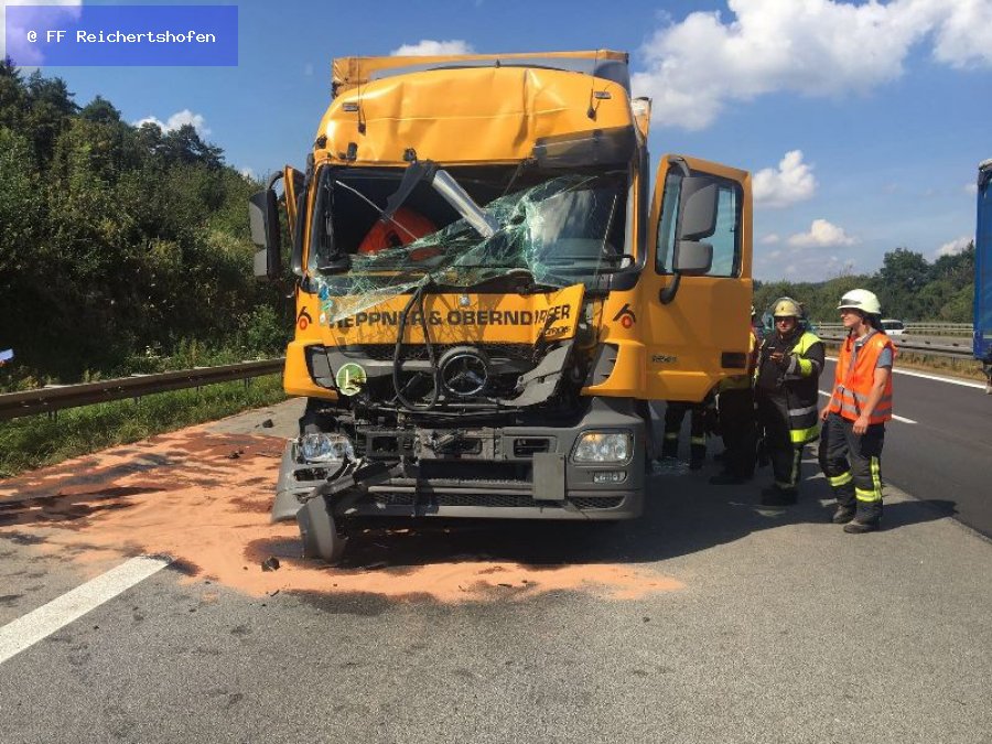 Zwei LKW fuhren einander auf, wobei der auffahrende LKW-Fahrer laut Meldung eingeklemmt sein sollte.
