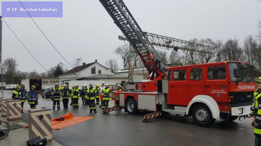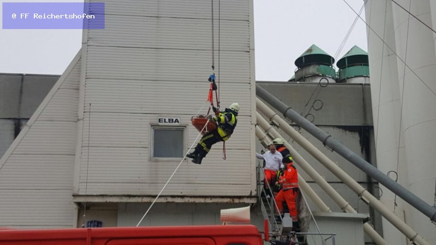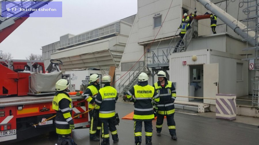 Wir unterstützten die Feuerwehr Ebenhausen bei der Rettung mit unserer Drehleiter und dem Absturzsicherungsatz, da der Bauarbeiter in ungünstiger Lage in etwa 6m Höhe lag.