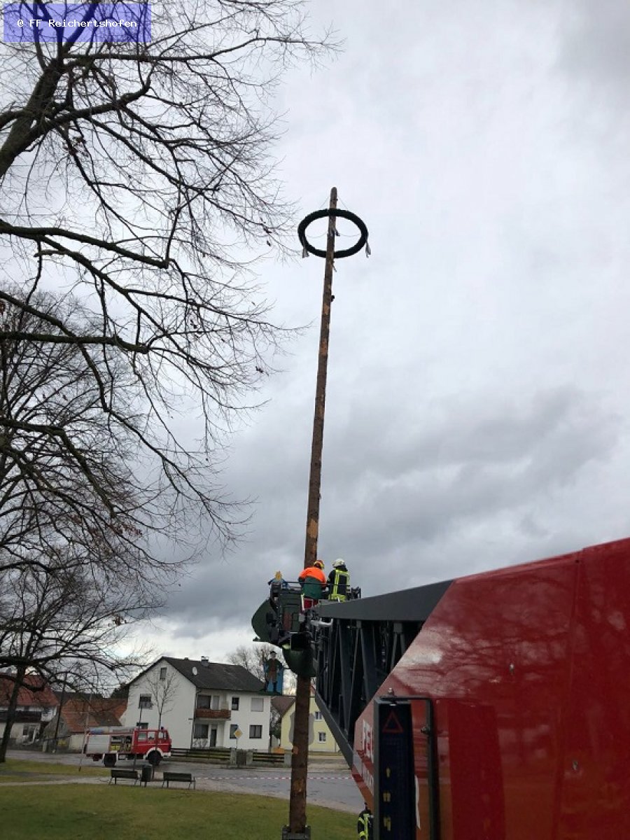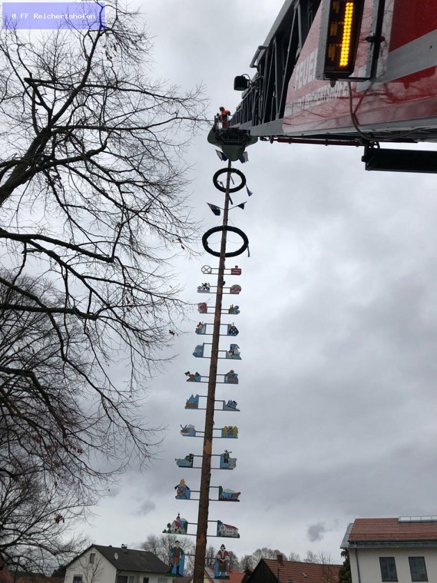 Der Maibaum in Baar hat durch den Sturm seine Standsicherheit verloren, dieser muss mit der Drehleiter abgetragen werden.