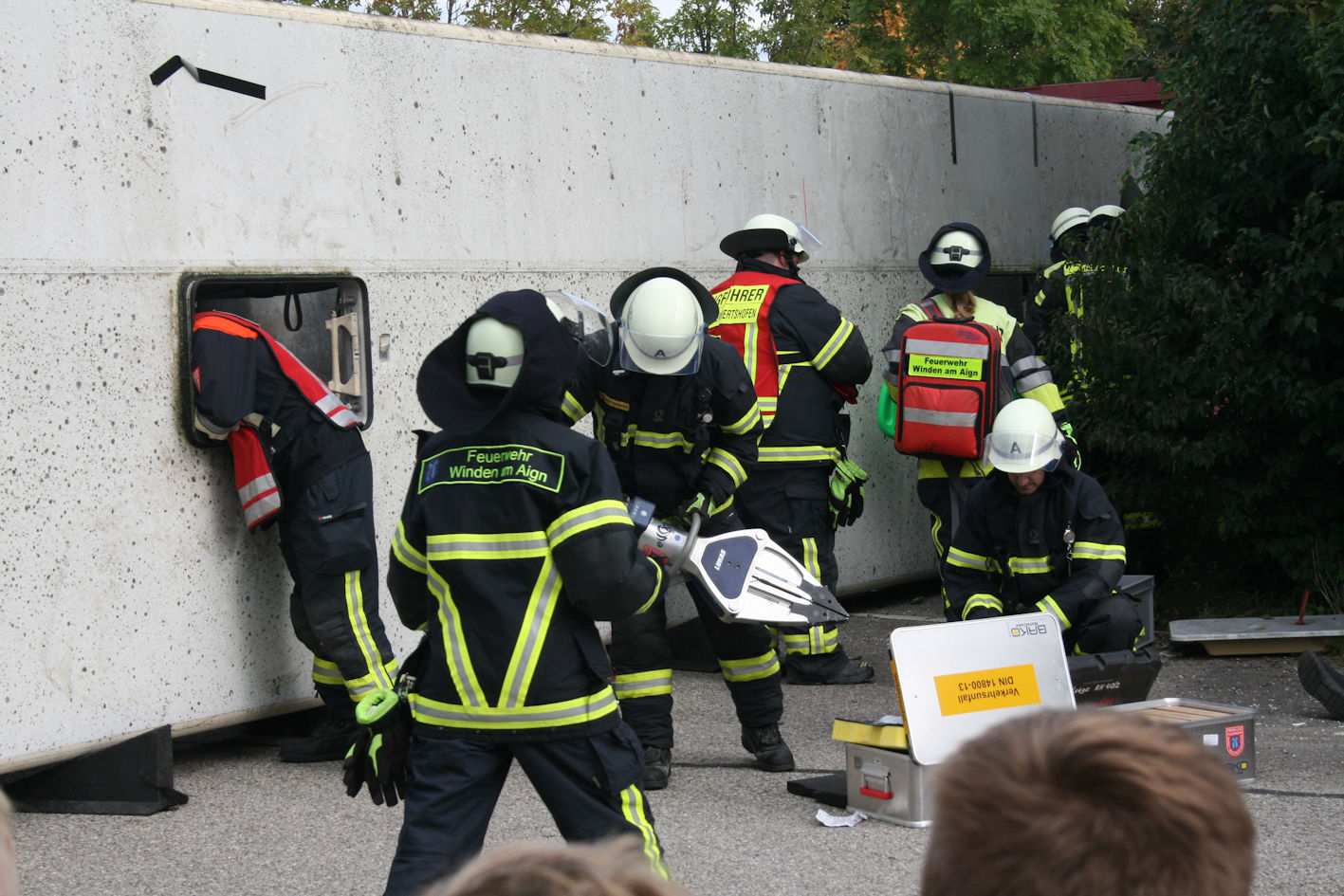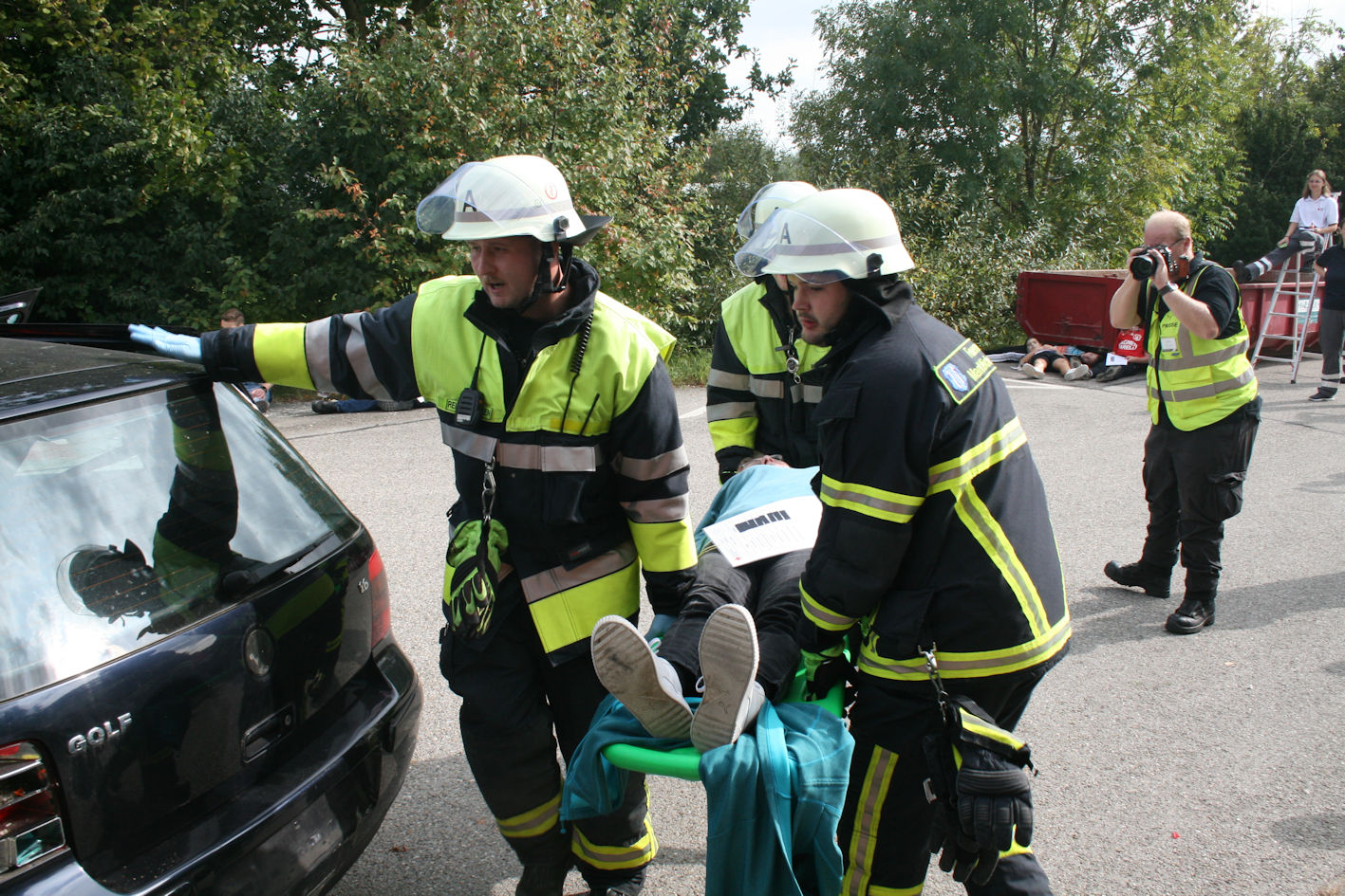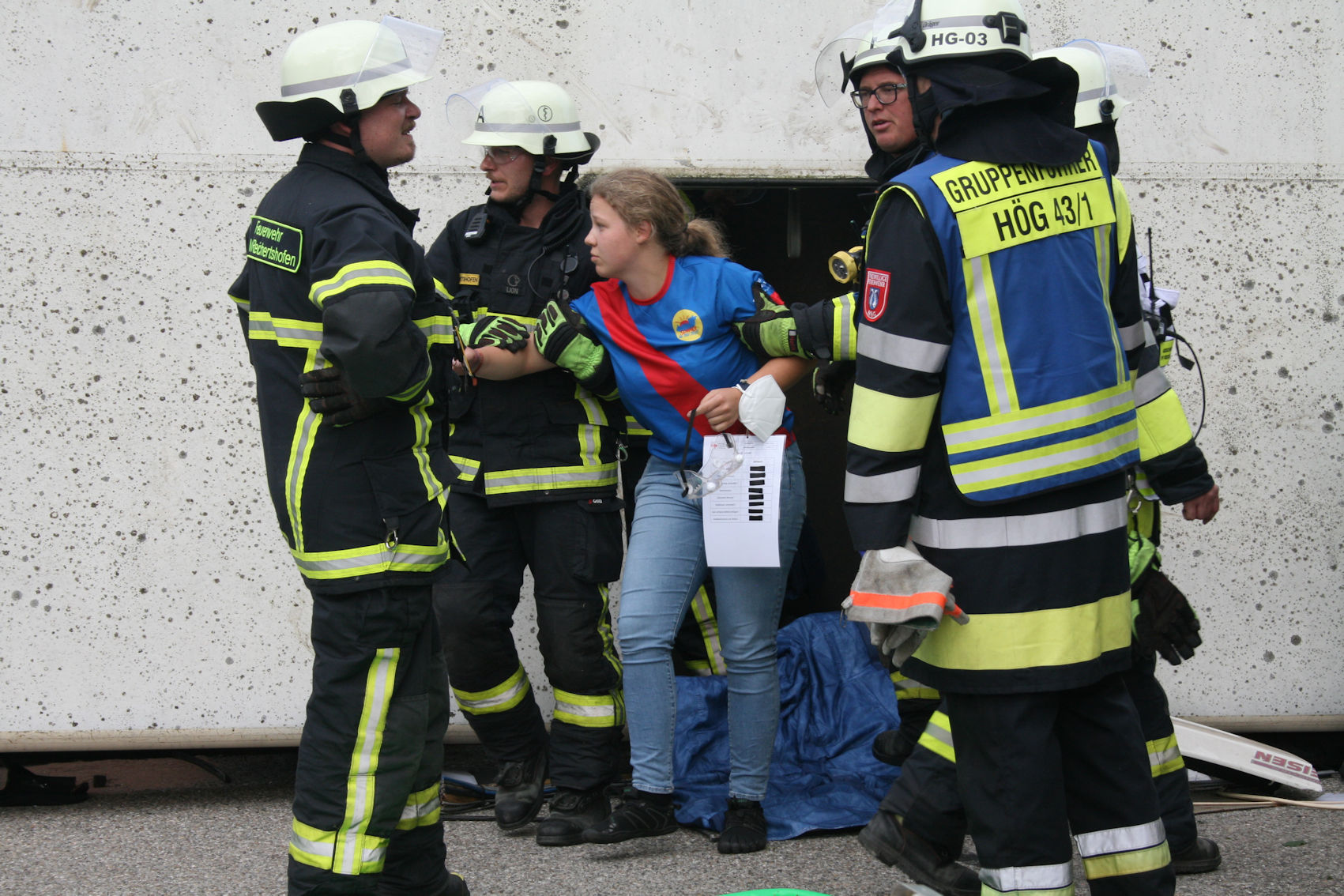 Nach und nach trafen Feuerwehr und Rettungsdienst an der Einsatzstelle ein. Es bot sich ein Schreckenszenario. Verletzte und unter Schock stehende Personen säumten den Bereich der Unfallstelle - dafür sorgten die realitätsnah geschminkten Mimen. Die Feuerwehren Hög, Langenbruck, Reichertshofen und Winden teilten sich die Aufgaben von Personenrettung und -betreuung. Nach und nach trafen erste Rettungswägen ein, welche die Patientensichtung vornahmen und damit entschieden, wie schwer ein Patient verletzt ist und mit welcher Priorität dieser in ein Krankenhaus kommen muss. Das Szenario sah auch vor, dass eine Person unter dem Bus begraben war. Diese wurde bereits bei der Sichtung für Tot erklärt.