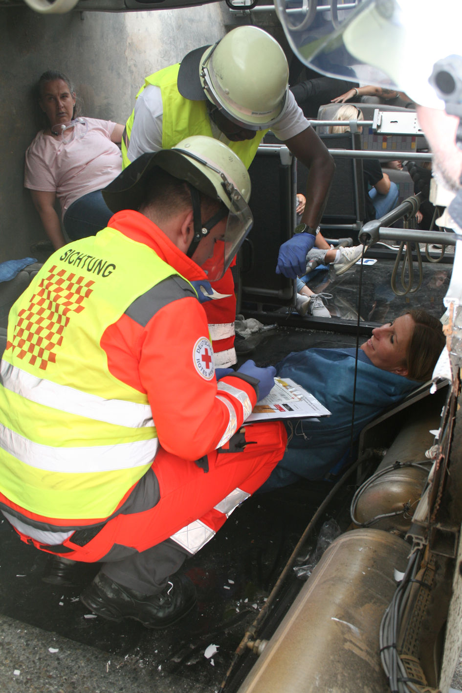 An Patientenablagen wurden die Verletzten behandelt, bis diese schlußendlich entweder vor Ort in einem Behandlungszelt medizinisch versorgt oder in ein Krankenhaus gebracht wurden. Die letzten verunfallten Personen waren gut 70 Minuten nach Übungsbeginn aus dem Bus bzw. PKW befreit.