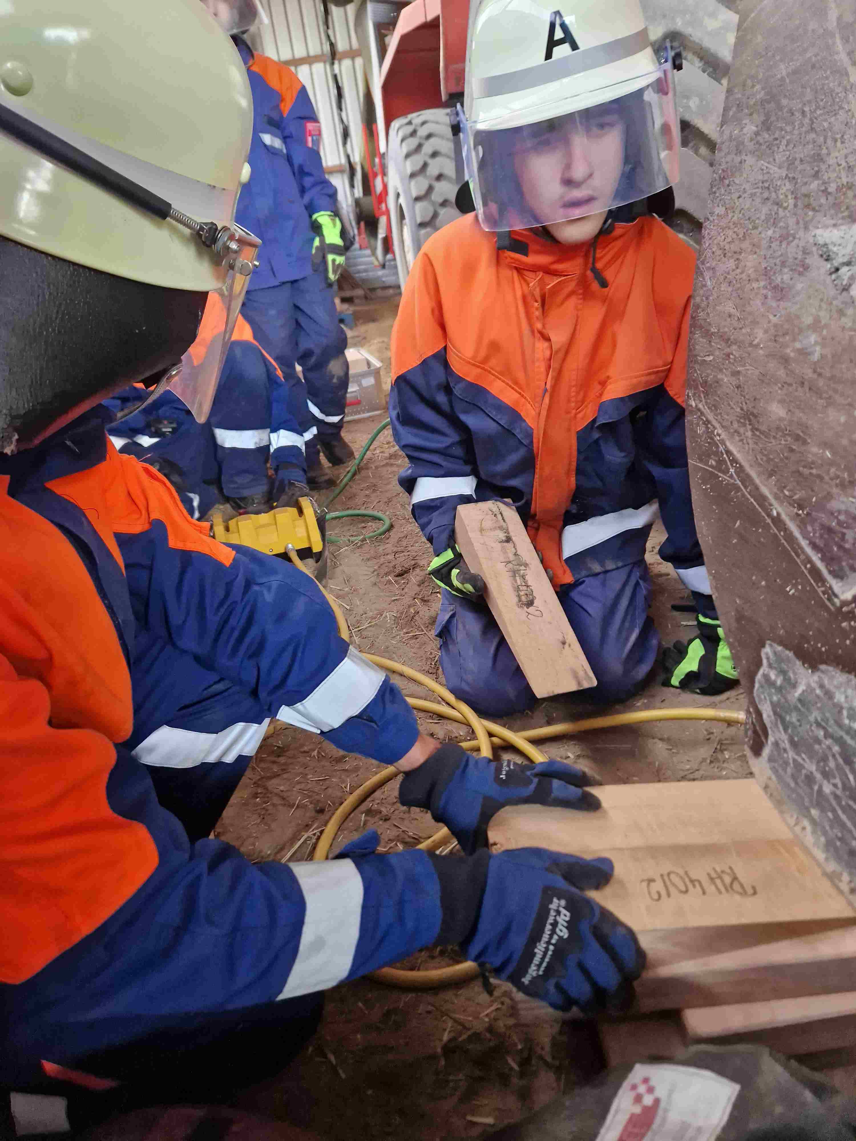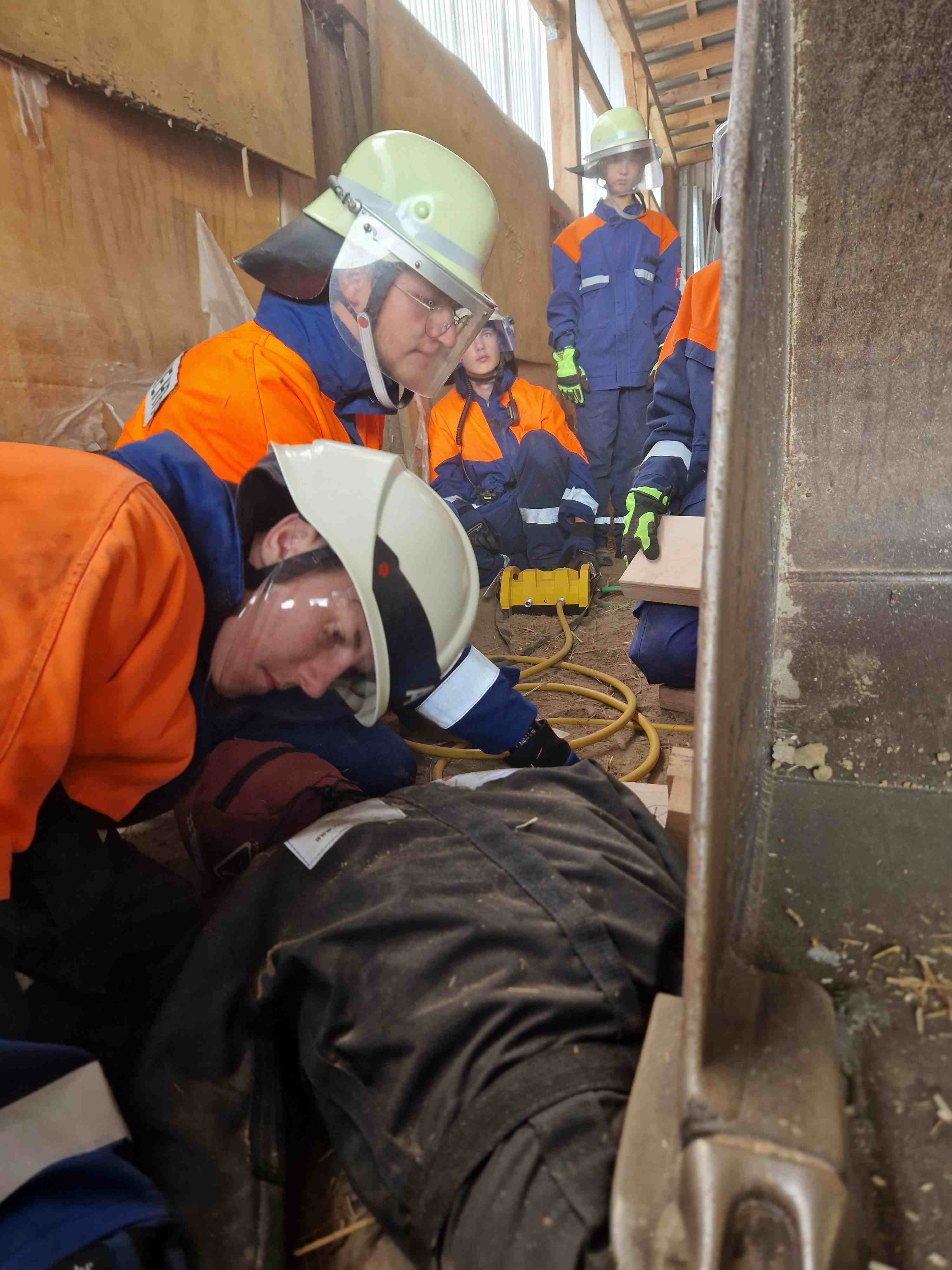 …und plötzlich geht wieder alles ganz schnell, als die Truppe zu einem schweren Einsatz gerufen wird, bei dem Ihr Know-How in Sachen technische Hilfe gefordert ist. Bei landwirtschaftlichen Arbeiten kommt es zu einem Zwischenfall, wodurch ein Mitarbeiter unter einer Lader-Schaufel eingeklemmt wird. Mittles Hebekissen konnte die technisch-medizinische Rettung in kürzester Zeit durchgeführt werden und der Patient dem Rettungsdienst übergeben werden. Klasse Teamwork!!!