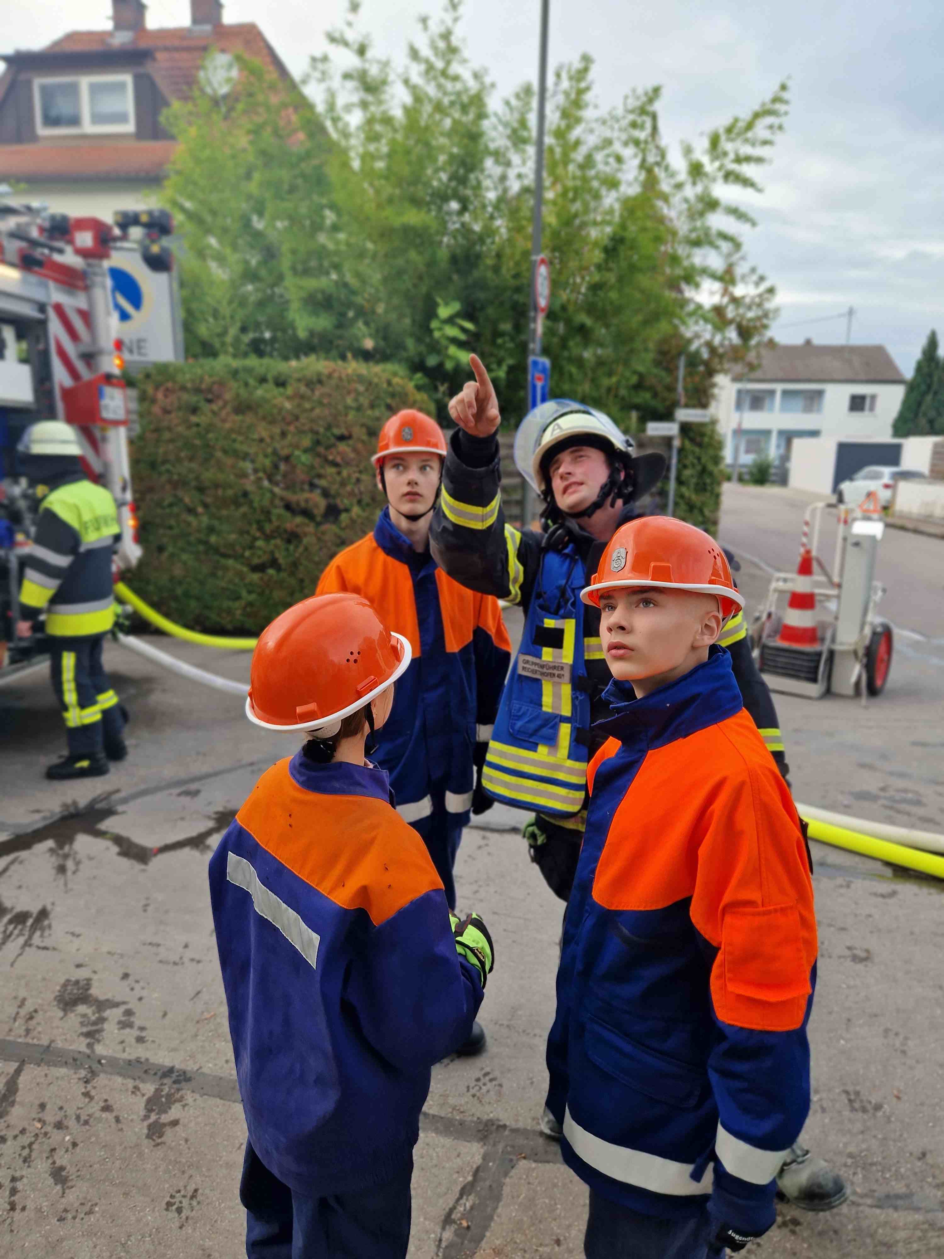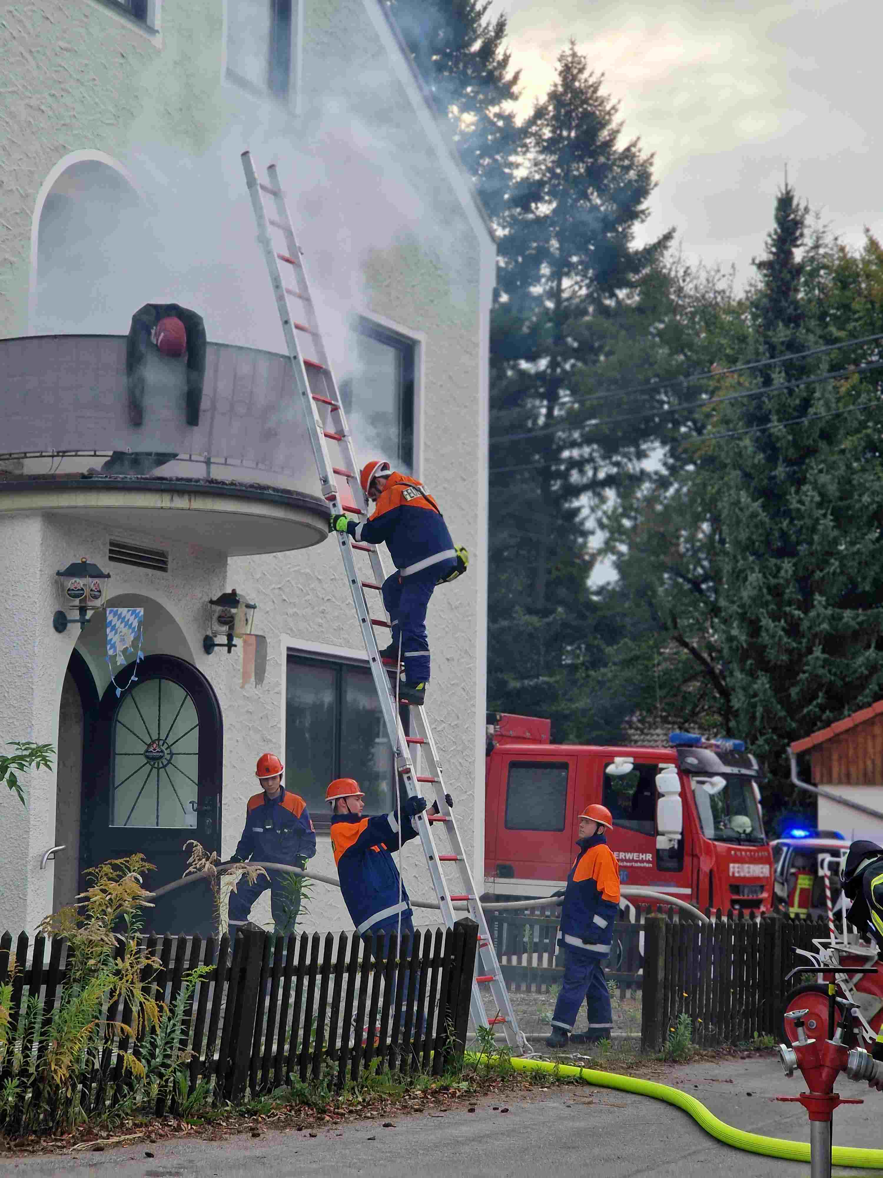 Jetzt geht es Schlag auf Schlag. Kaum auf Rückfahrt, wird das HLF mit der Drehleiter und dem Kommandowagen zu einem“B3-Zimmerbrand mit Personen in Gefahr“ alarmiert. Löschwasserentnahme, Löschaufbau, tragbare Leitern, Überdruckbelüftung. All diese Dinge, die im laufenden Jahr geübt wurden, mussten jetzt innerhalb von Sekunden sitzen und das taten Sie. Unterstützt wurden die Jugendfeuerwehrler von einigen Atemschutzgeräteträgern. Mit der Abschlussmeldung „Feuer aus, alle Personen gerettet, die Feuerwehr rückt ab“, konnten alle Einsatzkräfte wieder in die Wache einrücken. Dort hieß es selbstverständlich wieder die Einsatzbereitschaft von Mannschaft und Gerät herzustellen.